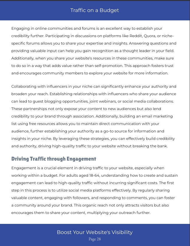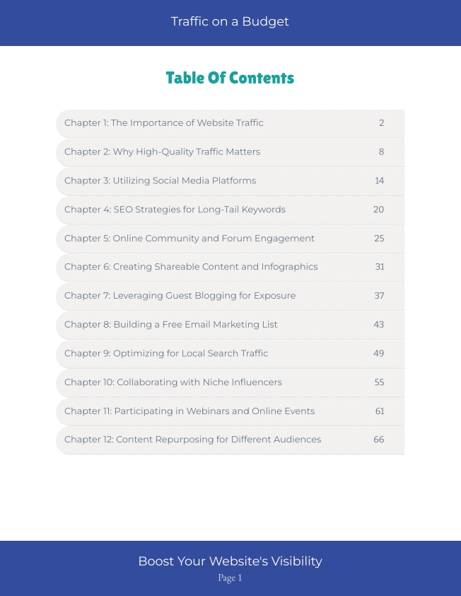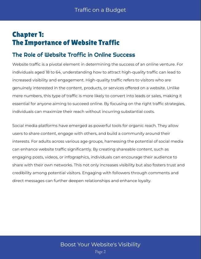 Unlock the secrets to driving consistent, high-quality traffic to your website and blog with "Traffic on a Budget"! This practical eBook reveals proven strategies for generating leads and boosting engagement without spending a fortune on paid advertising. Discover how to leverage SEO, social media marketing, content marketing, email marketing, and more to attract your ideal audience. Whether you're a small business owner, blogger, or entrepreneur, "Traffic on a Budget" is your essential guide to website traffic success on a limited budget.