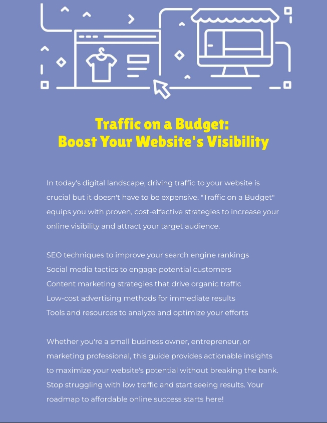 "Traffic on a Budget" is your no-fluff, actionable guide to getting more traffic to your website and blog. Forget the complicated jargon and expensive tactics! This eBook provides easy-to-implement strategies you can start using today to boost your online visibility. Learn how to optimize your content, master social media, and build a thriving online presence – all while keeping your budget in check. Stop dreaming about traffic and start driving it with "Traffic on a Budget.